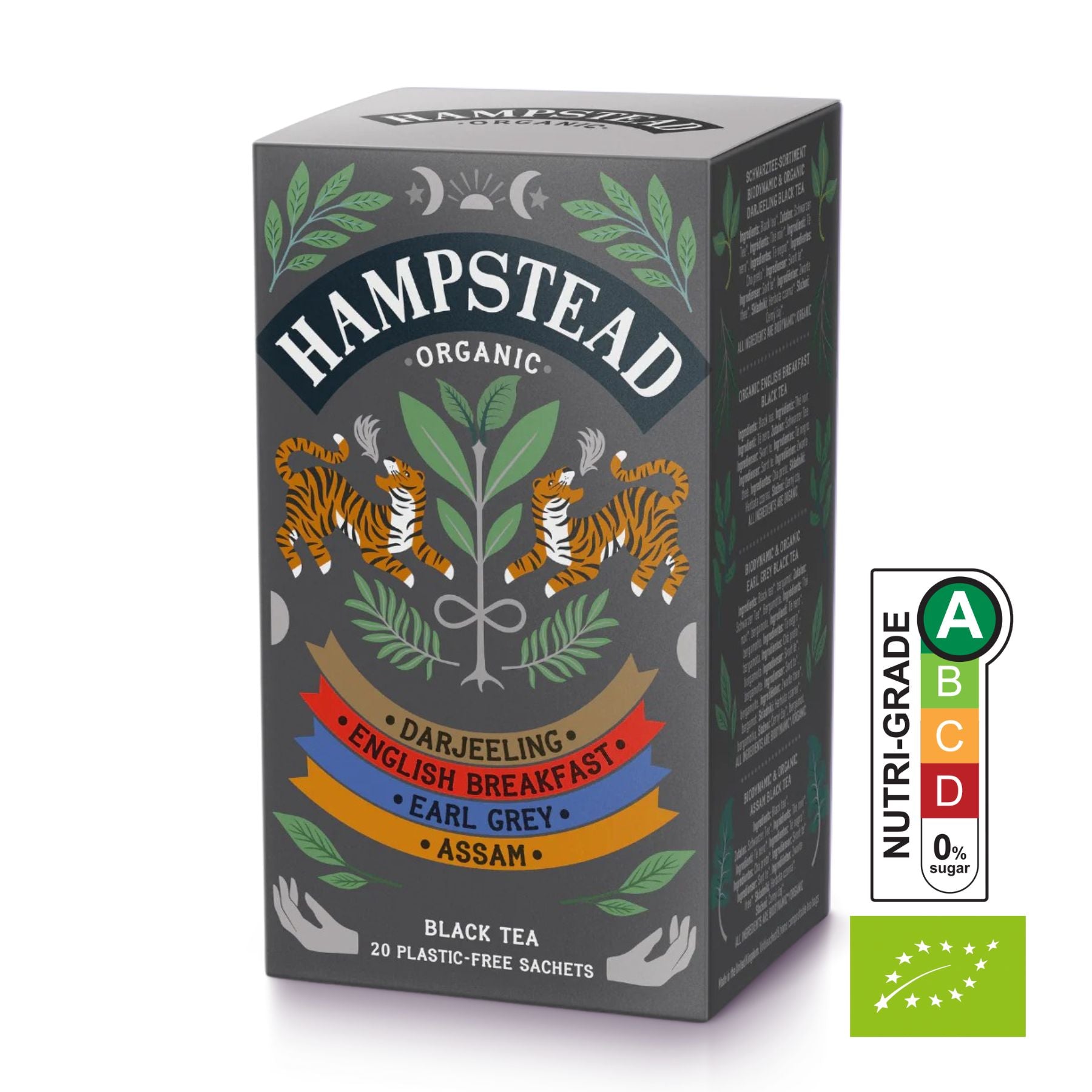20 tea bags in sachets, 5 tea bags of each tea. Hampstead Tea selection of Organic Black Teas to suit any occasion. Darjeeling - A light Black Tea for any time of day with gentle, floral, muscatel tones. English Breakfast - A punchy blend of African black tea and malty toffee Assam Tea. Earl Grey - The perfect balance of soft Darjeeling leaves and true Bergamot from Calabria. Assam - A Full flavoured Tea with discerning boldness and deep malty tones. Use one Tea Bag per person. Brew with freshly boiled water and infuse for up to three minutes.