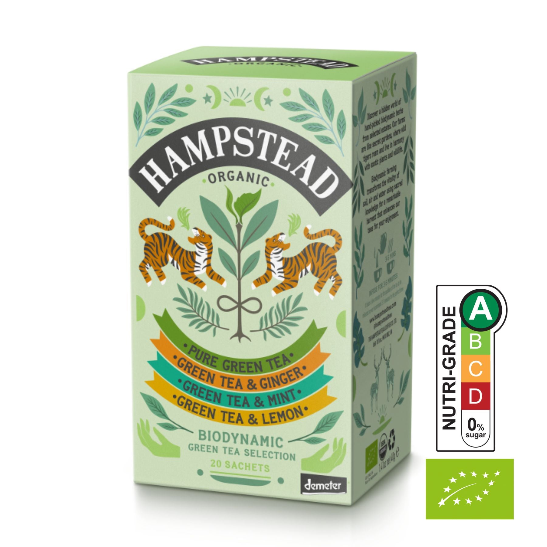 20 tea bags in sachets 5 of each flavour, try a selection of our organic green teas. All of our green teas are made with Darjeeling tea from the Makaibari Tea Gardens. Often called 'The Champagne of Tea' Darjeeling when made into green tea has a clear and refreshing taste. Pure Green - Delicate and fresh tasting, the only ingredient is organic green Darjeeling Tea. Green Tea & Ginger - A lively blend, ginger adds a zing to pure green tea. Green Tea & Mint - A luxurious blend of gentle green tea and the finest selection of hand harvested Egyptian Peppermint and Liquorice gently folded together to deliver the ultimate buttery mint sensation. Green Tea & Lime - A refreshing blend, of lime and green tea.Use one Tea Bag per person. Brew with freshly boiled water and infuse for up to three minutes. Organic & Biodynamically grown. All tea bags and packaging are plastic-free and compostable.