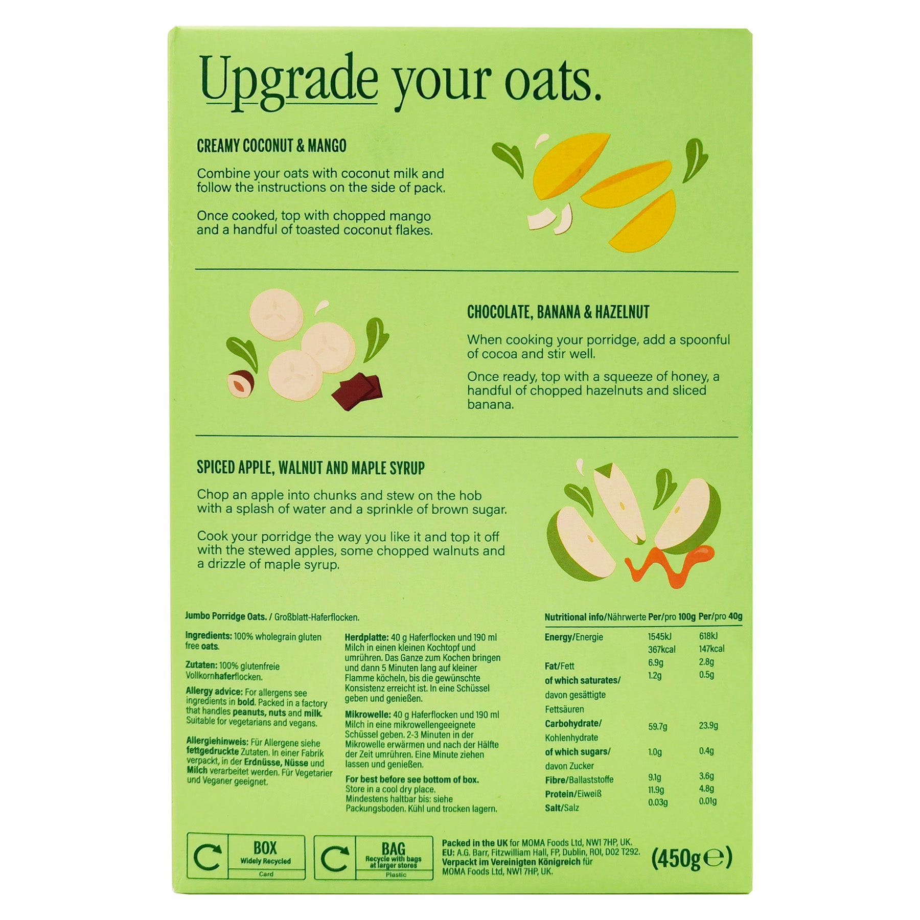 MOMA's signature naturally gluten-free British jumbo oats, just as they are, with nothing added. Just add milk, a plant-based alternative or water and pop in the microwave or on the hob for a delicious porridge breakfast.