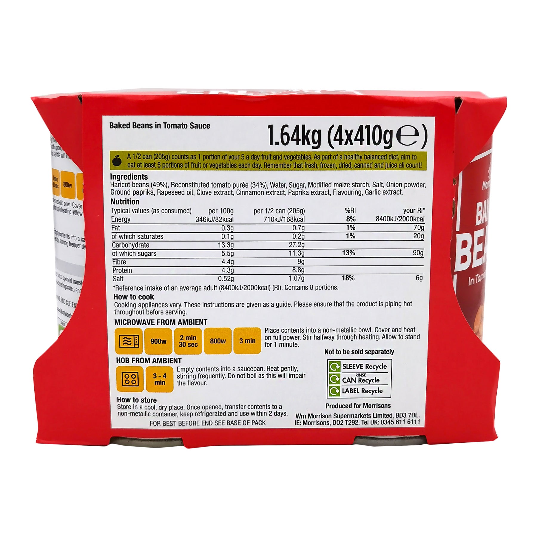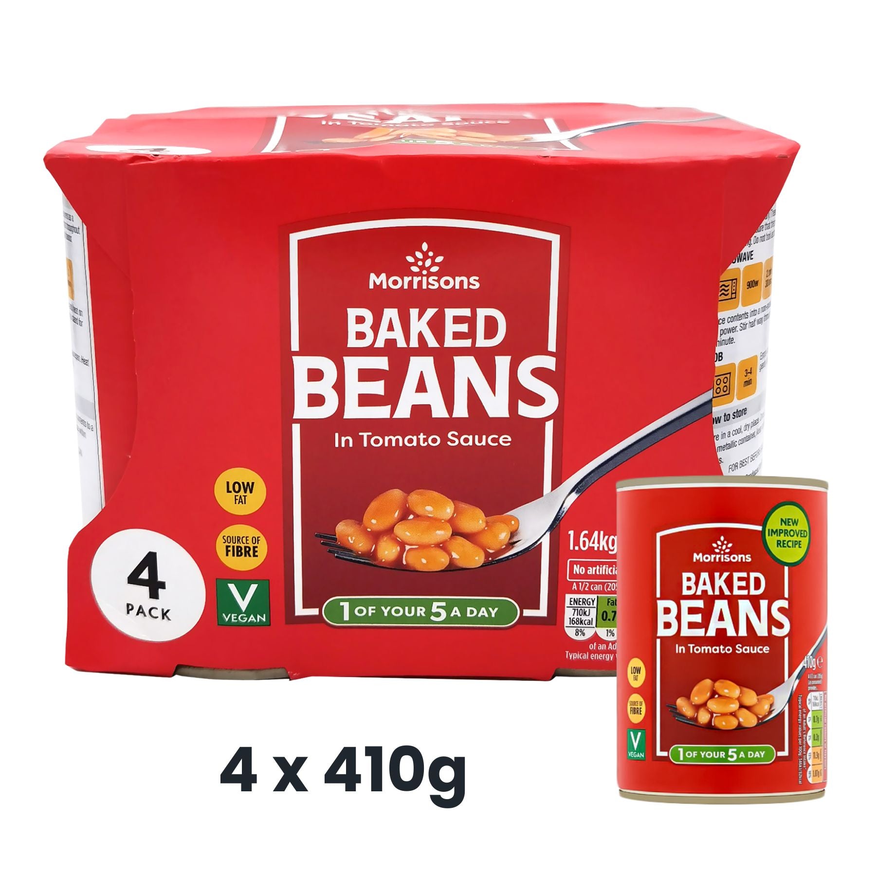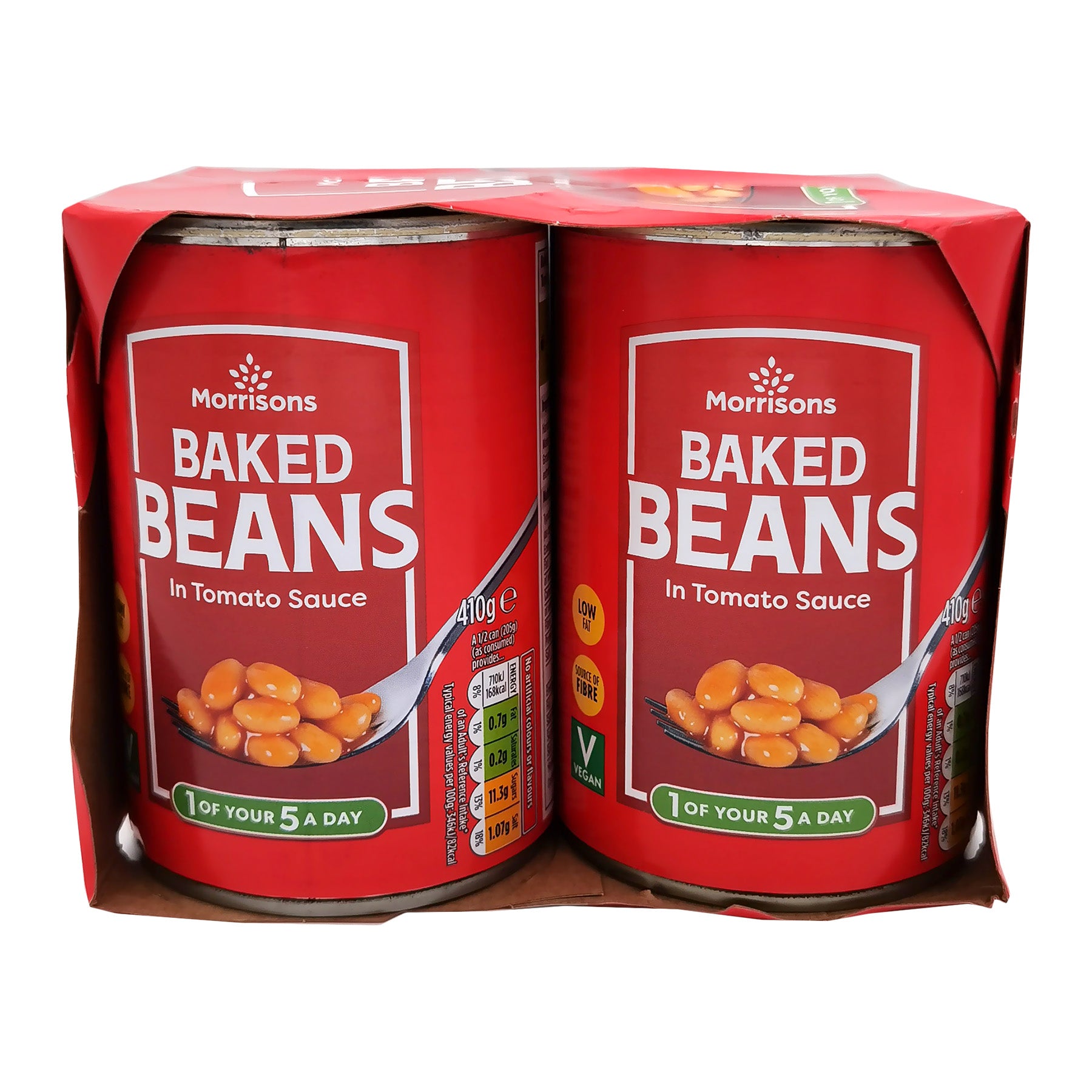 Morrisons Baked Beans 4 x 410g are haricot beans in a tomato sauce, and are a source of fibre, low in fat, and suitable for vegetarians and vegans. They are also one of your 5 a day and contain no artificial colours or flavours.