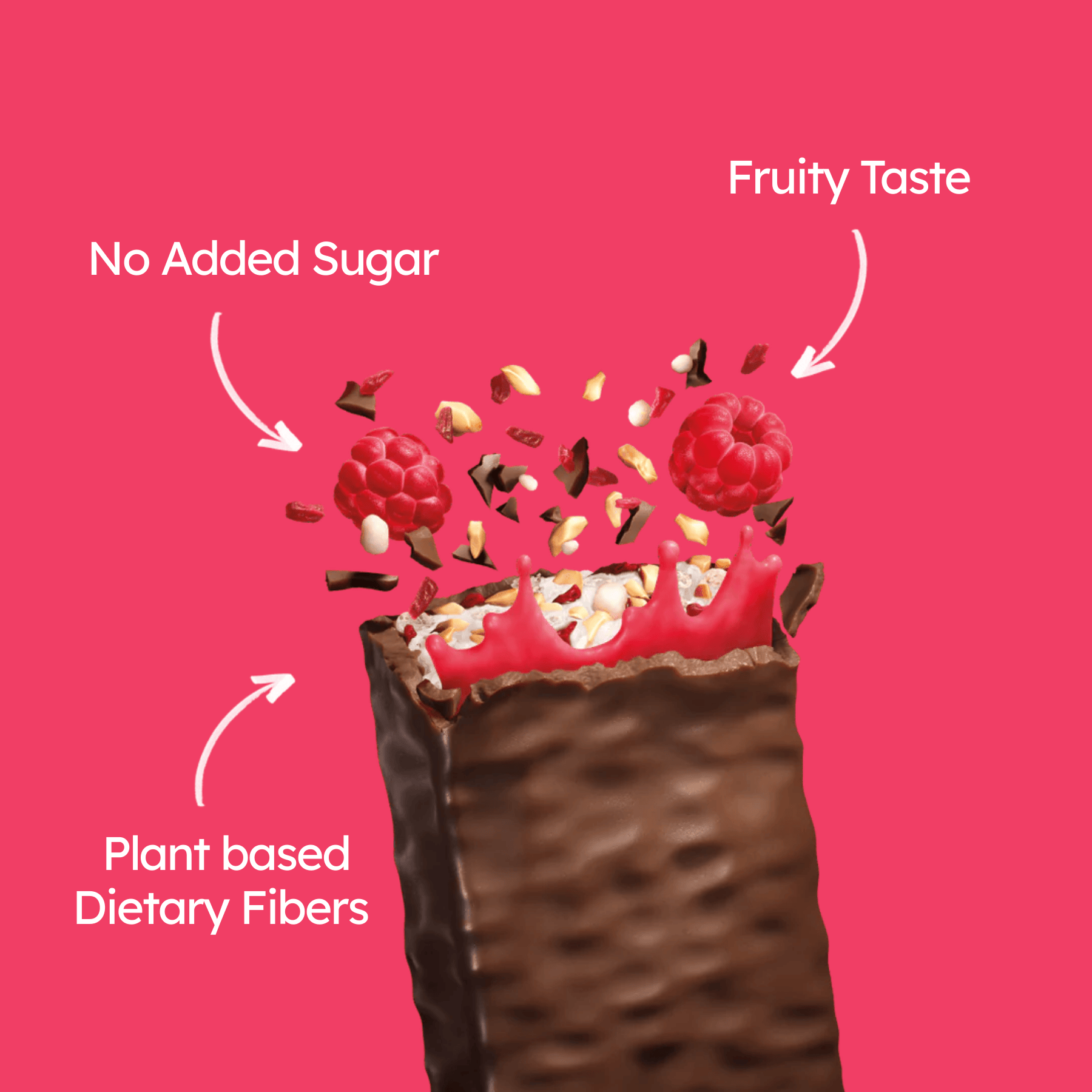 Almonds(25%), bulking agent: polydextrose; humectant: glycerol, sorbitol; shea butter, fully hydrogenated coconut oil, vegetable fibres (from agave, chicory, corn), dextrin, coconut flakes, whole milk powder, soy protein isolate, skimmed milk yoghurt powder (3%), freeze-dried raspberries (2%), sweetener: erythritol; fat-reduced cocoa powder, anhydrous milk fat, strawberry flavouring, black carrot juice concentrate, acidity regulator: citric acid; modified starch, emulsifier: lecithins; flavourings, salt, fully hydrogenated sunflower oil, emulsifier: mono- and diglycerides of fatty acids, sucrose esters of fatty acids; sweetener: sucralose (0,05%).