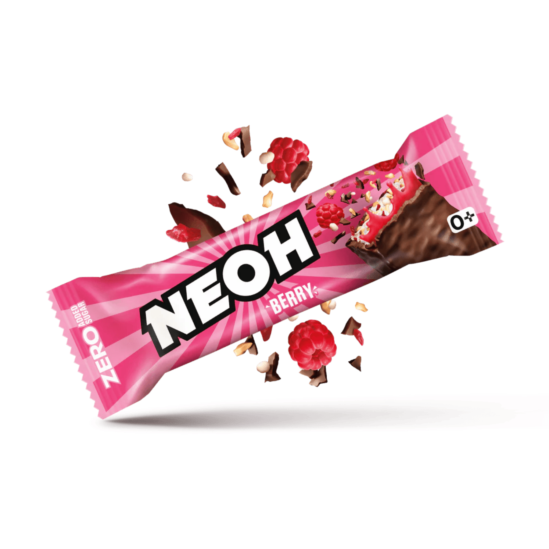 Almond bar with yoghurt berry flavour enrobed in 24% cocoa-containing fat glaze with no added sugar. With sweeteners.