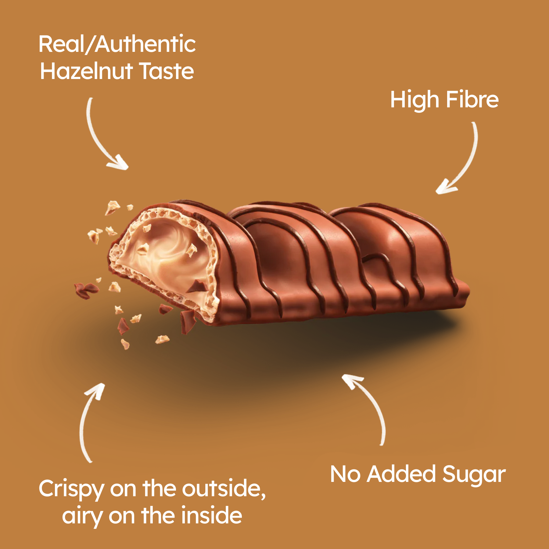 Wafer with a 51% milk hazelnut cream filling enrobed with 42% cocoa-containing fat glaze with no added sugar. With sweeteners.